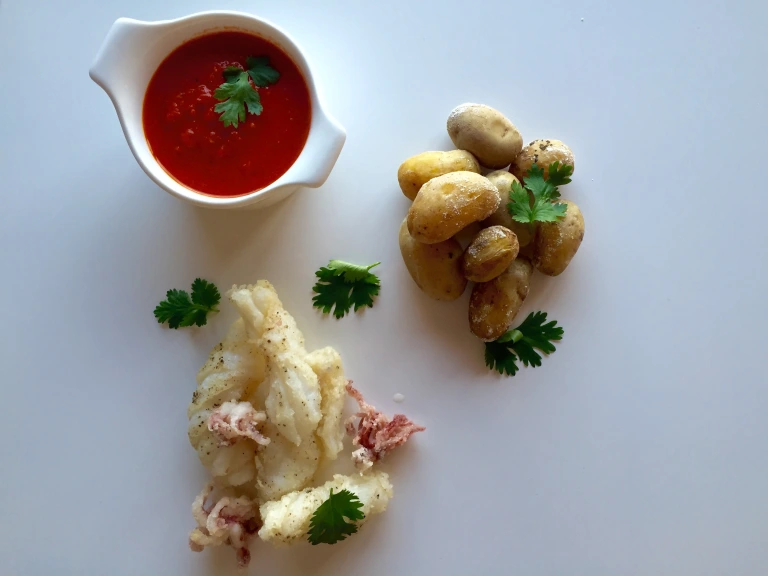 Deze aardappels worden traditioneel geserveerd met “mojo picon”, een pittige rode saus. Perfect om te combineren met de inktvis!